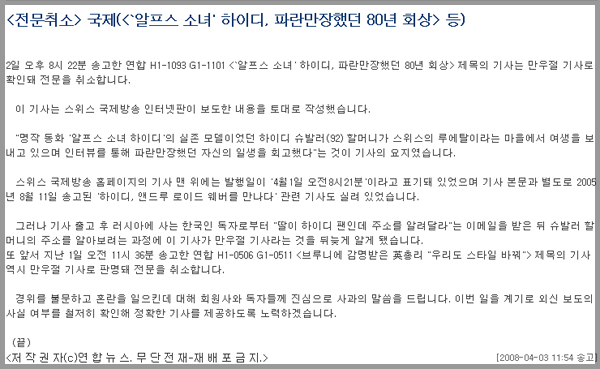 연합뉴스는 지난 3일 ‘전문취소’를 통해 “2일 오후 8시22분 송고한 연합 ‘‘알프스 소녀’하이디, 파란만장했던 80년 회상’제목의 기사는 만우절 기사로 확인돼 전문을 취소한다”고 밝혔다.