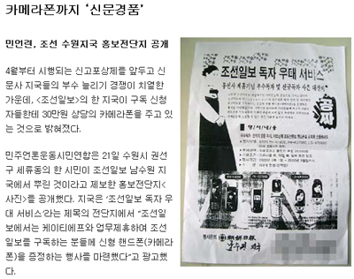 ▲ 2005년 한겨레신문 온라인에 등록된 신문 경품관련 고발 기사. 기사에 따르면 당시 조선일보의 한 지국이 실시 예정인 신고포상제를 앞두고 '30만원 상당의 카메라폰'을 경품으로 광고했다고 밝히고 있다. |