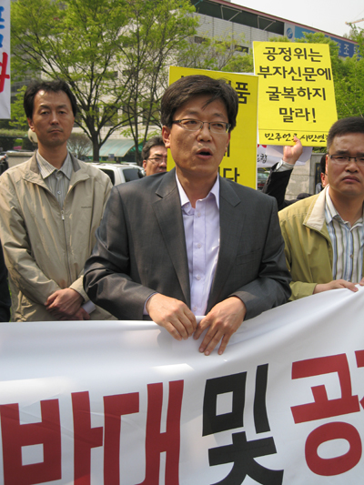▲ 16일 오후 2시 서울 서초구 공정거래위원회 앞에서 열린 ‘신문고시 개정 반대와 공정거래위원장 규탄 기자회견’에서 언론노조 최상재 위원장이 백용호 공정위원장을 규탄하는 발언을 하고 있다. |