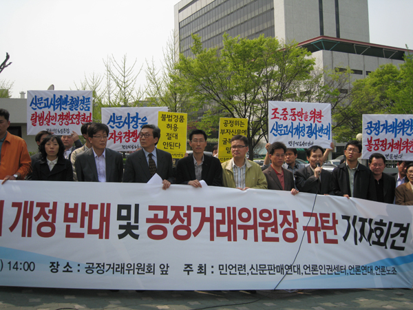 신문판매연대 민언련 언론연대 언론인권센터 언론노조 소속 회원 30여명은 16일 오후 2시 서울 서초구 공정거래위원회 앞에서 ‘신문고시 개정 반대와 공정거래위원장 규탄 기자회견’을 열고 공정거래위원장의 신문고시 재검토 발언을 규탄했다.