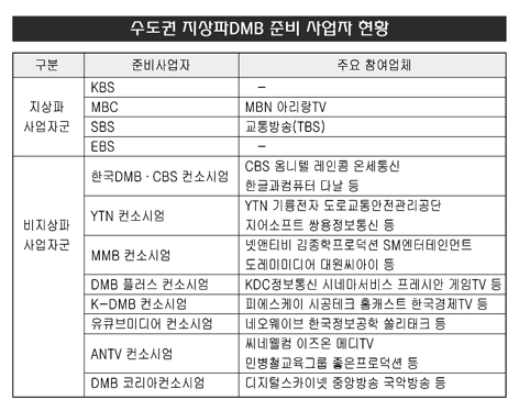 오는 3월 지상파 DMB 사업자 선정과 관련한 심사기준과 배점 및 평가요소가 발표된 가운데 참여 의사를 밝힌 예비사업자들 간의 본격적인 경쟁이 시작됐다. 기존 지상파 방송사들은 물론 콘텐츠 제공을 포함한 각종 컨소시엄 등은 모두 6개 채널 중 지상파사업자군 3개와 비지상파사업자군 3개의 사업권을 놓고 사업계획서를 마련하느라 분주한 모습이다.