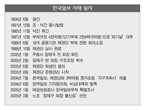 작년 한해 동안 경영위기에 따른 부도설로 홍역을 치른 한국일보가 또 다시 노조의 장 회장 불신임 선언 이후 긴장이 고조되고 있다. 이에 따라 편집국 비상대책위(이하 비대위)와 노조, 채권단은 “빠른 시일 안에 증자를 완료해 회생의 돌파구를 찾아야 한다”는 한 목소리를 내고 있다.