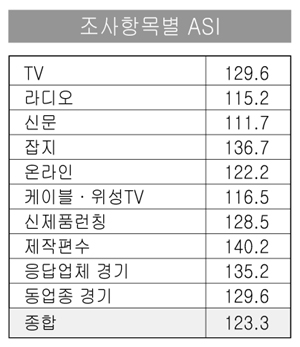 매체별 ASI는 잡지가 1백36.7로 가장 높았으며, TV(1백29.6), 온라인(1백22.2), 케이블·위성 TV(1백16.5), 라디오(1백15.2) 등의 순이다. 하지만 신문의 경우 ASI는 1백11.7로 매체 가운데 가장 낮았다.