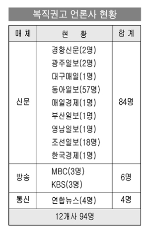 복직 대상자의 언론사별 분포는 동아일보가 57명으로 가장 많고 조선일보 18명, 연합뉴스 4명, 문화방송 한국방송공사 각각 3명 등의 순이다. <표 참조>