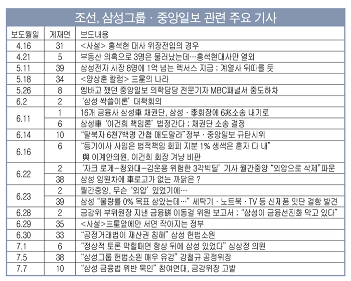 조선의 삼성과 중앙관련 보도는 삼성의 치부를 일부러 드러내기보다는 사실을 근거로 한 기사 밸류 조정, 지면 배치, 인용보도 등의 형태로 나타났다.