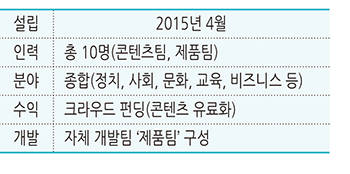 “10명의 구성원이 각각 역할 구분이 명확하게 돼 있다. 제품팀은 개발과 디자이너, 기술 쪽을 다루고 있고, 콘텐츠팀은 에디터와 마케팅 등이 포함돼 있다. 내부에 개발팀이 있다는 게 특이점이다. 개발자들은 콘텐츠를 단순히 퍼블리싱하는 걸로 끝내는 게 아니라 독자들이 편리하게 읽을 수 있도록 발생데이터를 분석하고 고객의 피드백까지 처리하는 역할을 한다.”