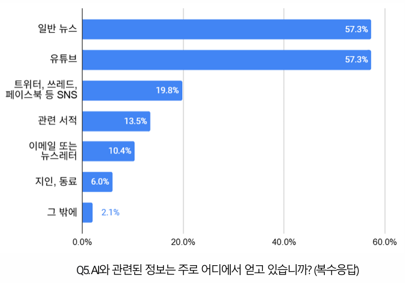 다만 AI 활용법에 대해 체계적인 교육을 받은 경우는 드물었다. 학회 등 전문 네트워크를 통해 AI 관련 정보를 얻는다고 답한 기자는 한 명뿐이었다. 대부분은 뉴스와 유튜브(각 57.3%)를 통해 정보를 얻는 것으로 나타났다.