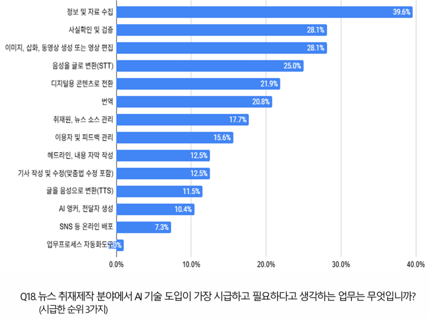 KBS가 구축한 AI 서비스에 만족한다는 답변도 4%에 불과했다. 응답자들은 “업무에 바로 적용할 수 있는 서비스 제공이 필요하다(32.3%)”는 점을 개선 사항으로 꼽았다. 향후 AI를 적극 도입하고 싶은 분야로는 정보 수집(39.6%), 팩트체크(28.1%), 이미지 영상·편집(28.1%) 등이 꼽혔다.