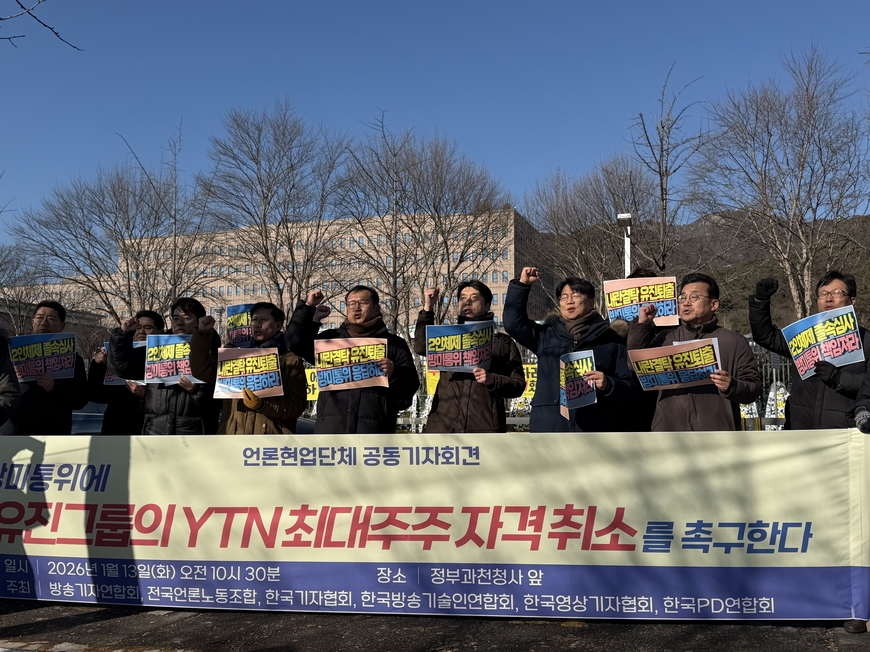 한국기자협회, 방송기자연합회, 전국언론노동조합, 한국방송기술인연합회, 한국방송촬영인협회, 한국영상기자협회, 한국PD연합회는 13일 과천시 정부과천청사 앞에서 기자회견을 열고 “달라진 것은 하나도 없다. YTN에는 윤석열 정권의 방송장악 외주화에 동참한 천박한 자본 유진그룹이 그대로 버티고 있기 때문”이라며 “방미통위는 위원회 구성이 완료되는 즉시 유진그룹의 YTN 최대주주 자격을 취소하는 절차에 나서라”라고 밝혔다.