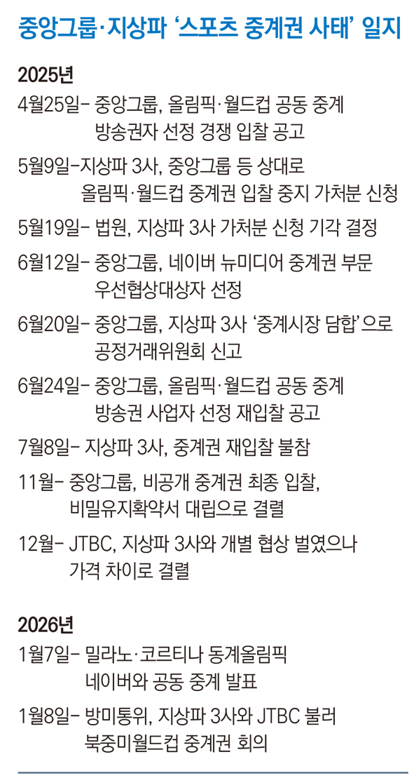 지난해 12월 중앙그룹은 중계권 재판매 의사를 밝히며 지상파 3사를 개별 접촉했다. 중앙그룹 산하 기업인 피닉스스포츠인터내셔널(주)이 빠지고 JTBC가 협상 전면에 나왔다. 특히 2026~2032년 올림픽과 2025~2030년 월드컵 중계권을 패키지로 묶어 한꺼번에 판매하지 않고, 밀라노·코르티나 동계올림픽과 북중미월드컵 중계권 재판매만 타진했다.