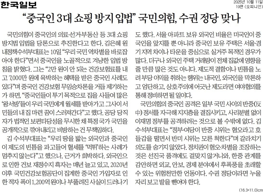 한국일보는 11일 사설에서 “국민의힘, 수권 정당 맞나”라고 꼬집었다. 이 신문은 “중국인 공격은 일부 국민 사이의 반중 정서를 자극해 지지층을 결집시키고, 사리분별 없이 이재명 정부를 공격하려는 것으로 볼 수밖에 없다”며 “정치권이 혐오·차별을 조장하는 것은 선진국 품격에도 걸맞지 않거니와, 한중 관계를 감안하면 외교, 안보, 경제 분야에서 후폭풍을 초래할 수 있는 위험천만한 언동”이라고 경고했다.