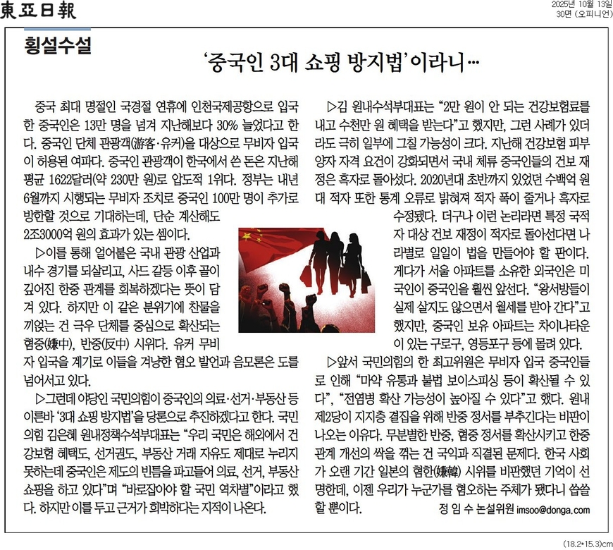 국힘 '중국인 3대 쇼핑 방지법'에 보수·진보언론 일제히 비판