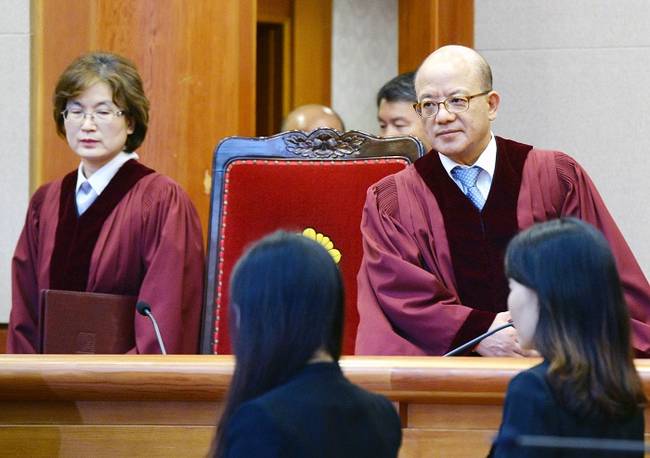 ▲박한철 헌법재판소장과 재판관들이 지난달 28일 서울 종로구 재동 헌법재판소 대심판정에 자리하고 있다. 이날 헌법재판소는 '김영란법'으로 불리는 '부정청탁 및 금품 등 수수의 금지에 관한 법률(부정청탁금지법)'에 대해 합헌 결정했다.(뉴시스)
